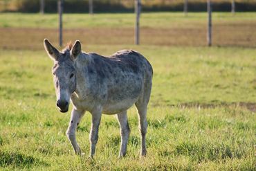 Pickle, a roughly 12 year old standard john donkey came with the herd of rescues in 2023. Pickle arrived as a scared & unsure of humans boy. As time goes on, he has become so much more confident with humans & loves the snacks they come with! In 2024, we realized during his dental exam that his teeth needed some extra help. We sent him to Midwest Veterinary Dental to have a more thorough exam of his teeth done. Needing all 12 of his front teeth removed, Pickle is happier & healthier today. He can still eat hay & grazes healthily. Pickle is UTD on all vet & Farrier work.